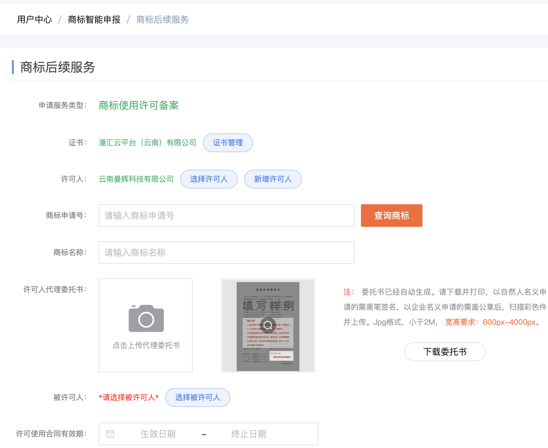 企业完成品牌授权合作后,通过系统“商标使用许可备案”功能,自动填充双方信息、商标信息,生成标准合同模板,一键提交后自动跟踪审查进度,无需反复查询。