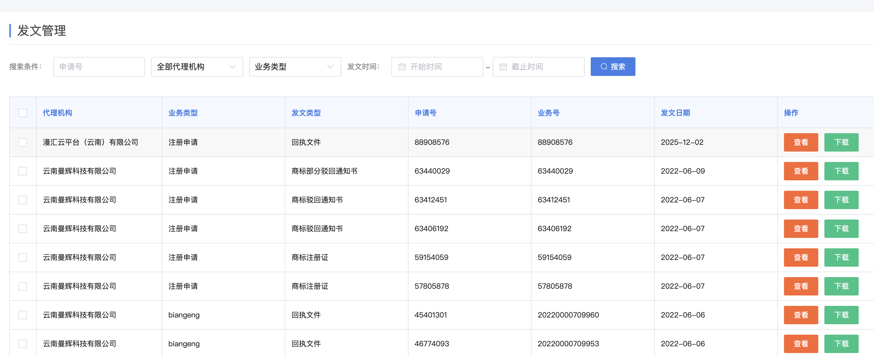 代理机构同时处理多个客户的变更、续展、转让业务, 申请人信息 智能管理,发文文件随时查看下载,所有业务缴费管理 。系统 全流程操作留痕,清晰可查。